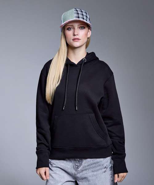 Shaped to fit. 320gsm. Peached fabric, soft-feel finish. Waffle knit hood. High polished, nickel free eyelets and drawcord ends. Polyester dyed to match tubular draw cord. Brushed fleece inner. Twin-needling detailing creates a high quality finish. Cut and sew two by one ribbed cuffs and hem. Kangaroo pouch pocket. Self-coloured neck size label.