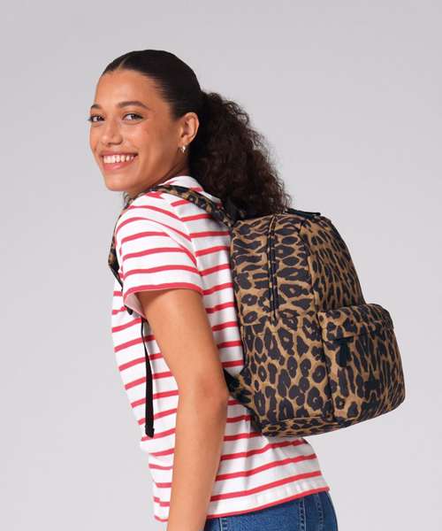 The Leopard print mini backpack is compact in size but big on attitude. Made from 100% certified recycled polyester, it’s perfectly sized for daily essentials, with a zipped main compartment and front pocket for secure storage. The bold leopard print turns practical carrying into a standout style statement.