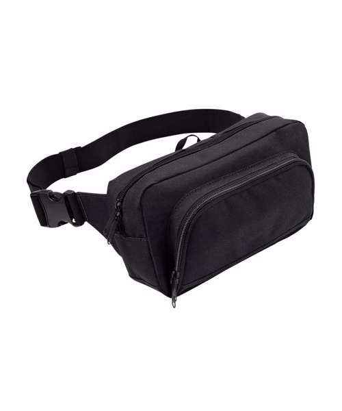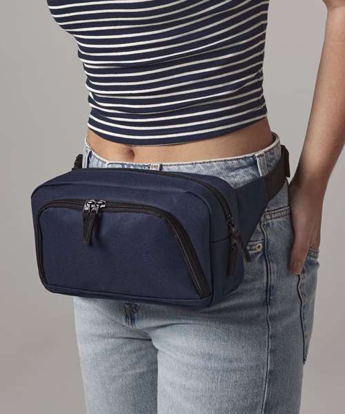 Adjustable webbing belt with secure clip fastener. Headphone port. Zippered rear pocket. Large zippered main pocket. Internal mesh pocket. Key hook.
