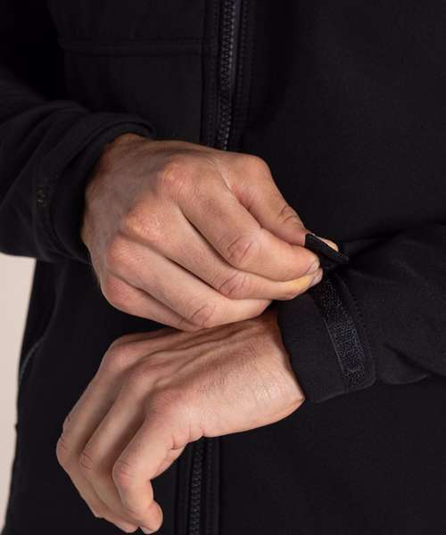 Part recycled polyester elastane softshell with borg back, AquaDry Membrane, H2OShield DWR finish and part recycled zip tapes. GRS Certified fabrics, ETI factories, REACH compliant.