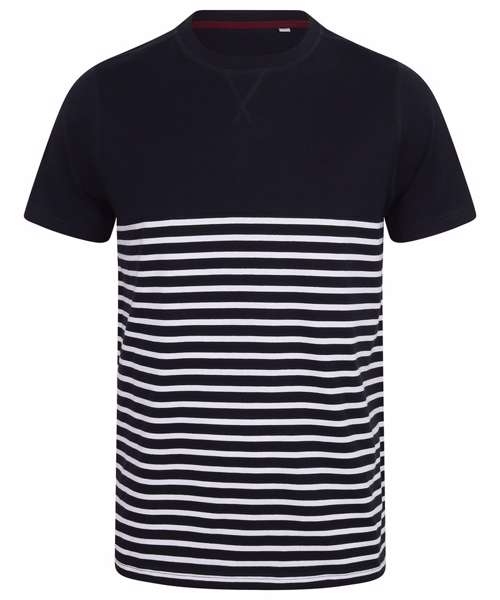 Tag free regular fit, heavyweight short sleeved t-shirt. Crew neck with stretch ribbed neckline. Twin-needle stitching at cuffs and hem. 'V' flatlock stitching detail at neck. Flatlock stitching at neck, shoulder seam and armholes. High chest seam. Striped lower body; contrast plain upper body and sleeves. Coordinates with FR134 long sleeved Breton T.