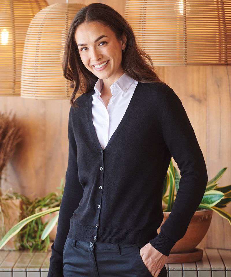 This v-neck cardigan offers a traditional style cardigan with self-coloured pearlized buttons in a quality fine knit made to perform. Offered in corporate colours there is an option for all. This style is part of our 50 cotton/50 acrylic range where you can mix and match your styles.