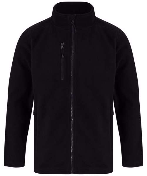 Fabric using recycled materials. Made from recycled polyester. Anti-pill microfleece. Recycled zips. Set-in sleeves. Shoulder panel. 2 single welt zipped pockets. Zipped chest pocket. Back neck tape. Back neck outer hanging loop. Full-length front zip with zip guard and facing. Non-slip zip pulls. Stretch binding on collar and cuffs. Henbury cut-out label for easy rebranding.