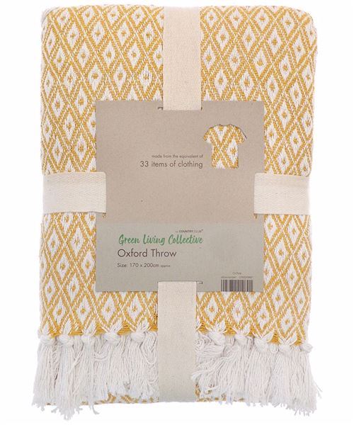 Oxford design throw made from recycled fabrics, 170 x 200cm. Beautifully soft, made from reclaimed clothing mixed fibres. Modern geometric pattern with plain ivory fringing to edges. Help the environment with an eco-friendly throw – ideal for a bed or sofa, or as a picnic blanket.