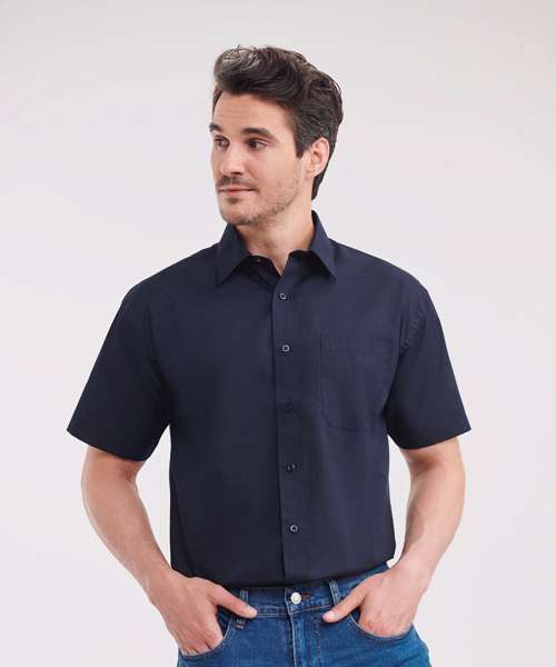 Smart and stylish shirt design in a fine poplin fabric. Classic style boned collar. Back yoke with 2 side pleats. Pocket over left chest mitred edge. Straight bottom hem. The elegant lightweight fabric is especially suited to finer embroideries.
