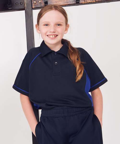 Coolplus® specially modified polyester fibres enable rapid absorption of sweat from skin surface. Contrast white piping along raglan seams and down front and back. 2 button placket, self-fabric collar.