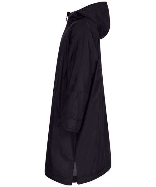 Water-resistant robe with sherpa fleece lining and a three-piece hood. Full double-ended zip down centre front. Zipped pockets with fleece lining. Inner zipped pocket with water-resistant lining. Inner embroidery access zip. Hook and loop fastening at wrist. Side vents.