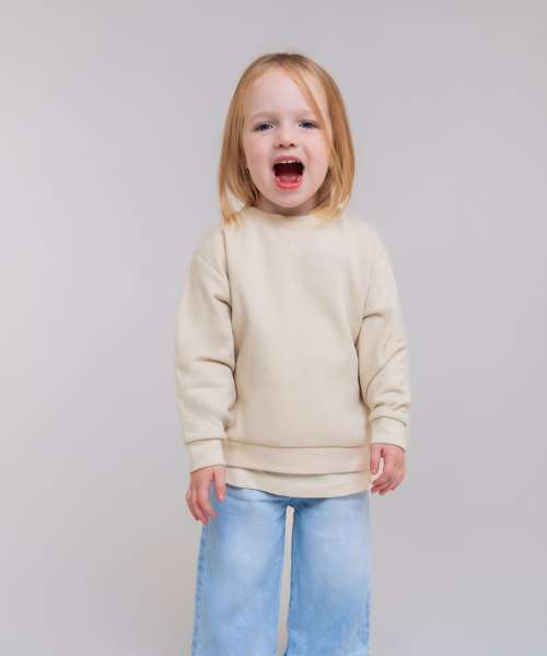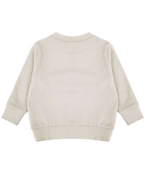 Kids' sweatshirt made in recycled fabric with self-fabric knitted rib at neck and cuffs. Flatlock V stitching detail at the CF neck. YKK popper fastening on the shoulder on sizes 0/6 – 24/36 only. Tag-free.