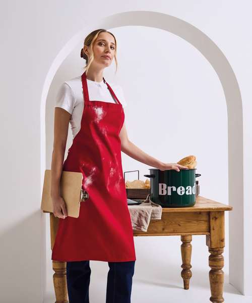 A heavyweight and durable bib apron made with 100% certified organic cotton. Available in twenty popular colours with self-fabric waist ties and neckband.