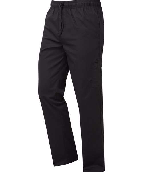 These chef's trousers are designed with classic cargo style pockets on both legs that are deep enough to hold a mobile device. Tear release fastening for security. The waistband is elasticated for comfort with a drawcord for adjustment. There is handy rear patch pocket with tear release fastening.
