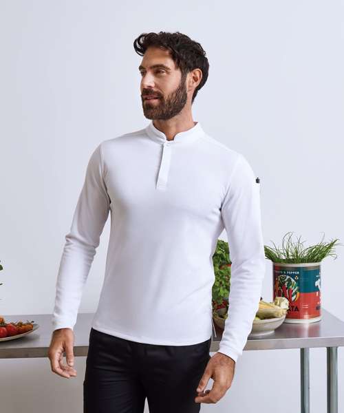 This long sleeve chef’s shirt is made with Premier’s Coolchecker® fabric, guaranteeing a moisture-wicking and breathable performance. Offering value for money, it’s a great solution for those working in the catering and hospitality industries, designed with a press-stud-fastening neckband and a mandarin collar stand, while a covered placket conceals two press stud buttons. To the reverse, there’s a press-stud button tab on the neckband to hold an apron in place and a mesh-back panel to provide airflow through the fabric; and the left sleeve has a useful pen pocket. Side slits in the hemline allow movement through the shirt and provide a pleasing silhouette. Made from 100% certified recycled polyester.