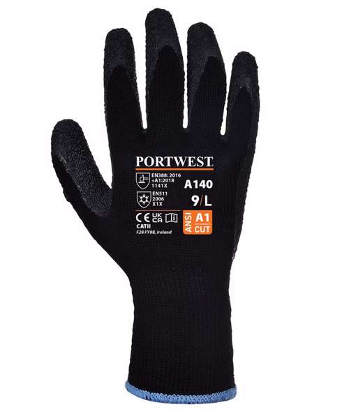 Conform to EN388:2016 (1.1.4.1.X). EN420 and EN511 (X.1.X). Seamless 10 gauge premium quality grip glove for cold conditions. Black latex crinkle finish on warm acrylic liner with elasticated knitwrist for secure fit. Ideal for outdoor heavy duty tasks. Applications: construction, transportation, refuse collection, maintenance, local authority.