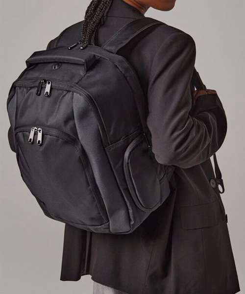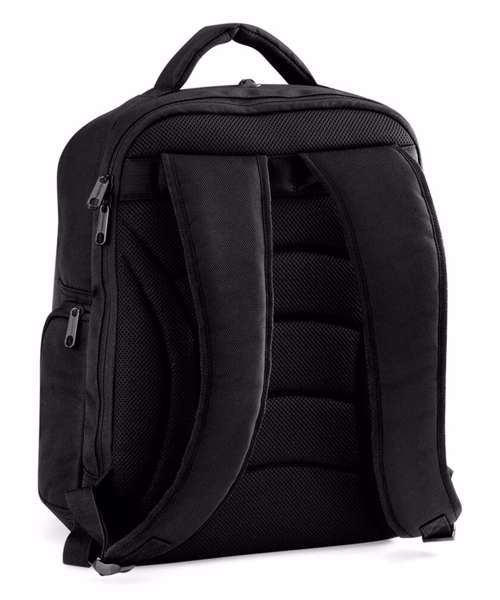 Media pocket and headphone port. Padded laptop compartment. Laptop compatible up to 15.6". Padded adjustable shoulder straps. Front pocket organiser section, side zippered pockets, and water bottle holder. Grab handle.