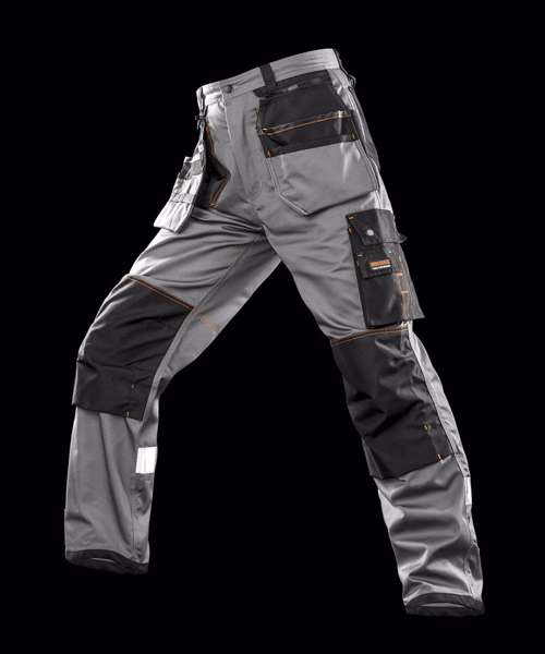 Removable multi-use front pocket system including. ID pass pocket. Contrast stitch bar tack stress points. Bellowed cargo and rear pockets. Front zip with rivet fastening. Reflective back leg strip. Belt and hammer loops. Cordura® ankle hem. Knee pad pockets. Belt loops. D-rings. Co-ordinated X-OVER range. Generous fit. Tough and hardwearing look for on- and off-site wear. Reinforced ankle hem for scuff resist.