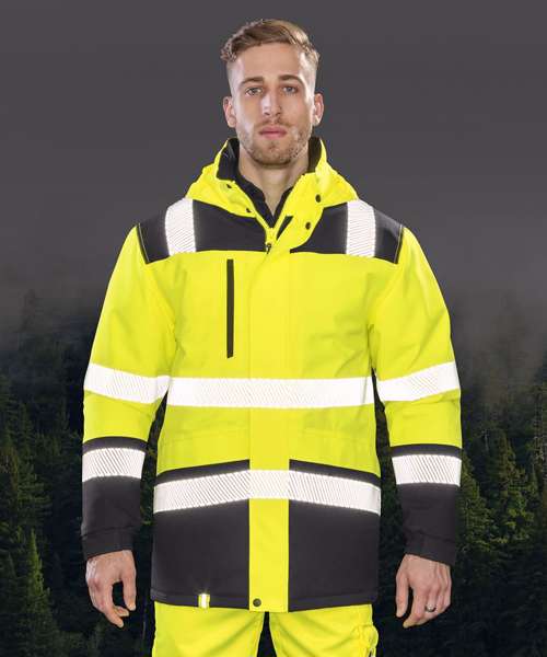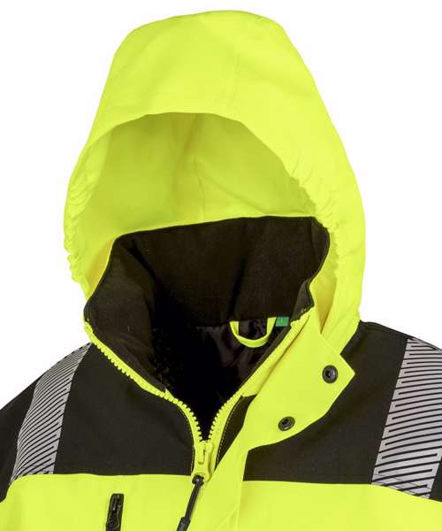 A soft stretch, high visibility safety, waterproof, windproof and breathable garment in printable fabric. Highly technical with features such as tear release and part elasticated cuffs, reflective print body bands and an adjustable foldaway hood, finished off with stylish black colour contrasting.