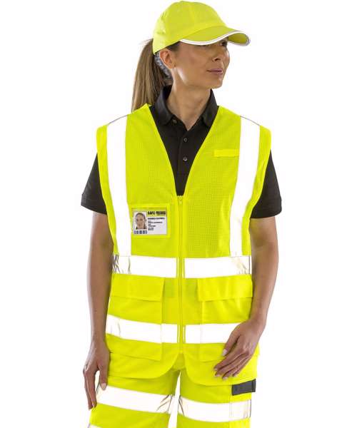 Lightweight mesh safety vest with 50mm sewn on reflective body bands. Self-coloured bound edges. Tear release patch pockets. ID pass pocket. Zipped closure. Radio loop. EN ISO 20471:2013 Class 2 .