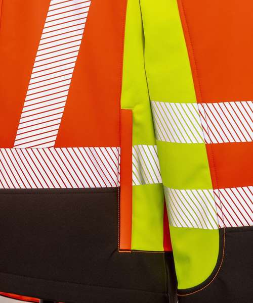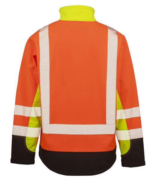 Ultra-comfortable, highly visible, tri-colour, recycled, printable safety softshell with printed arm, shoulder and body bands.