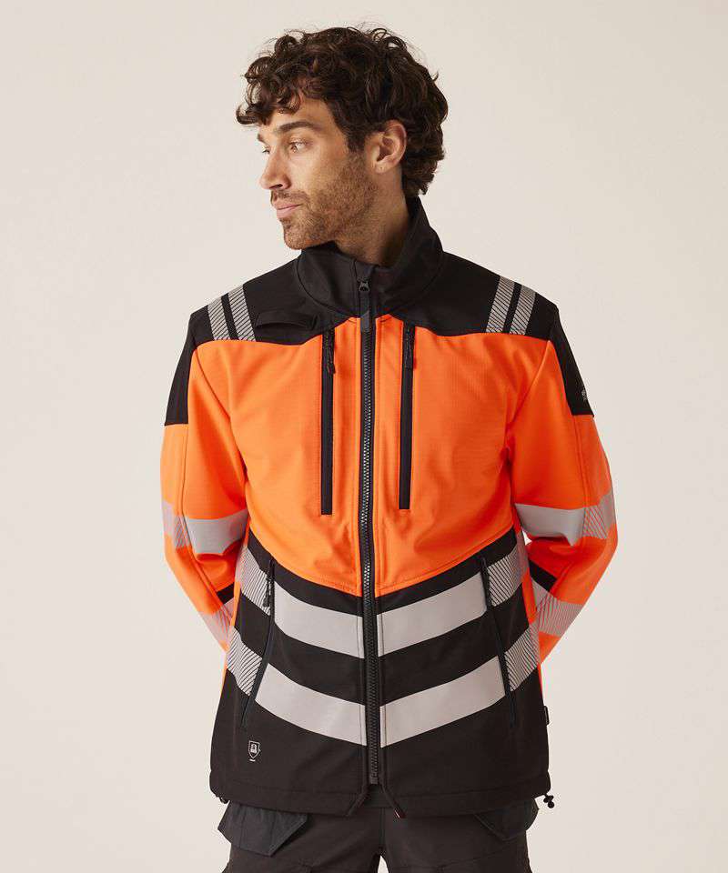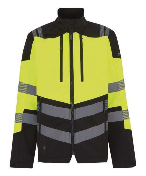 96% Polyester, 4% spandex 3L softshell with warm grid fleece backing and water-repellent finish. Certified EN ISO 20471:2013 +A1:2016 Class 2. Detachable hood with adjusters. Heat-applied reflective tape, with segmented tape on strategic panels for additional comfort. Six pockets. One radio loop. Inner stormguard. ID reflection – angled chevrons identify which way you are facing. Made with recycled content.