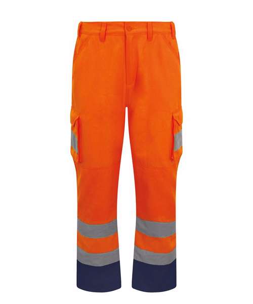 Certified EN ISO 20471:2013+A1:2016. RIS-3279-TOM ISSUE 1:2016 (Orange only). HV Orange/Navy & HV Yellow/Navy - Class 1. Navy - Non Certified. Water-repellent finish. Side elasticated waistband with 7 belt loops. Zip fly fastening. 2 side seam pockets. 2 cargo pockets. 1 rear pocket with tear and release fastening. Internal knee pad pockets. 2 bands reflective tape around leg.