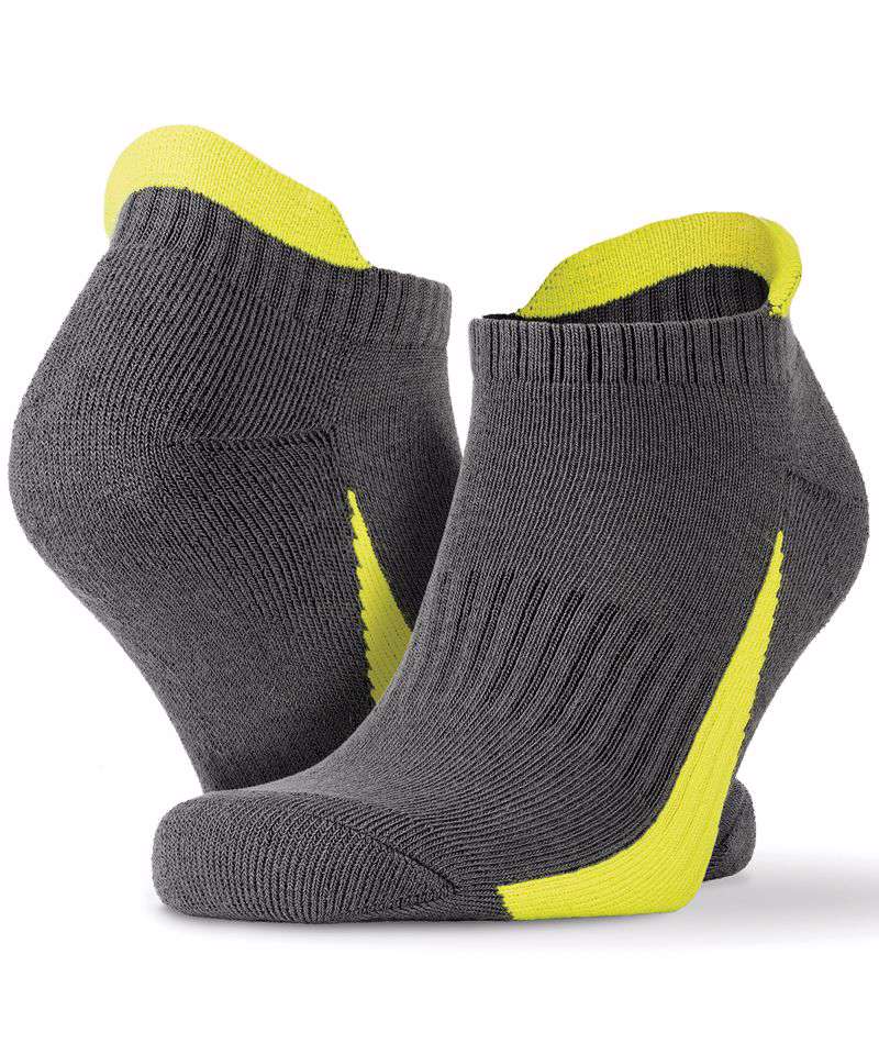 Co-ordinated with Spiro teamwear. Cushioned comfort: stategic double-layer cushion impact. Secure fit: ribbed instep reduced movement & risk of blisters. Rib cuff and instep. Contrast colour trim. Low cut sports fit with ankle tab.