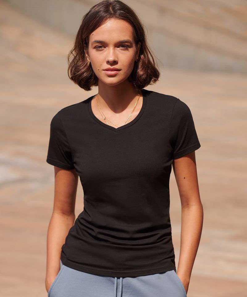 Feel good women's stretch t-shirt with enzyme wash for unique soft hand-feel. 96% cotton, 4% elastane for improved fit, comfort and shape retention. Modern long-line fit. V-neck with back neck binding and soft stretchy rib neckline. Features tear out label.