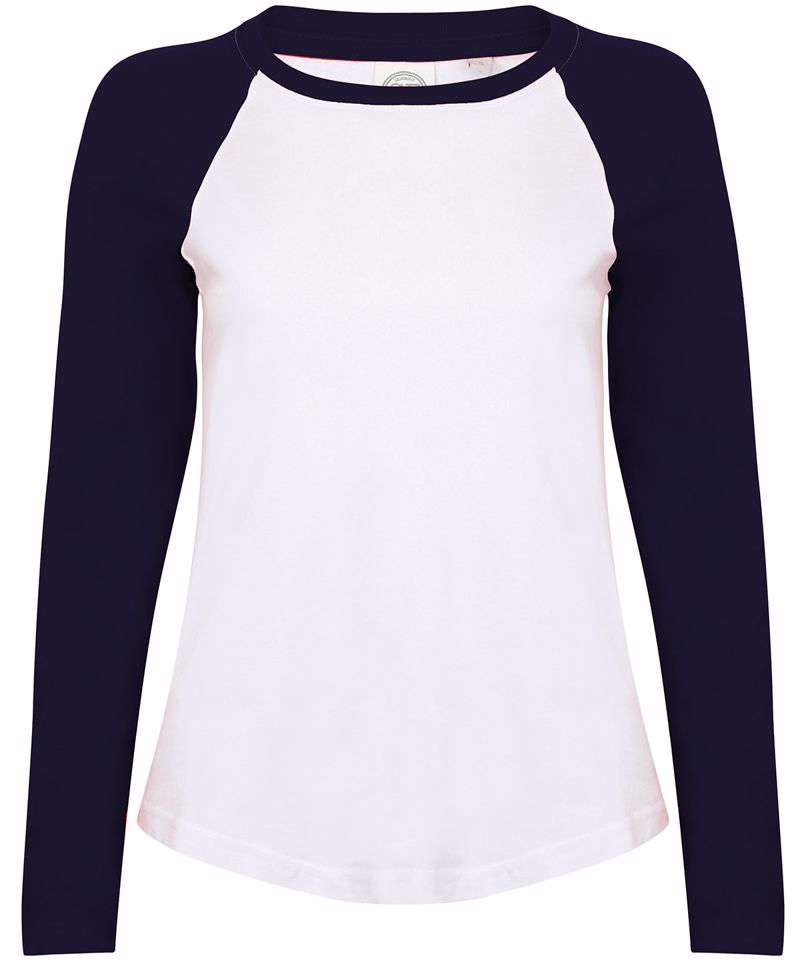 Tear-out SF (Skinnifit) label. Contrast raglan sleeve and ribbed neck with back-neck tape. Long-line fit and shaped side seams. Twin-needle curved hem. Unisex. Matches men's SK271 and women's SM271 Long sleeved baseball T's.