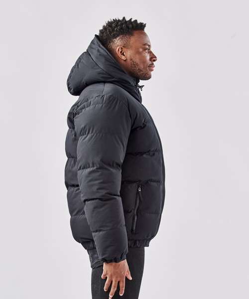 Pure Earth by STORMTECH™. STORMTECH 2-Layer H2XTREME® 15000/10000 waterproof/breathable outer shell. STORMTECH Thermolex™ high loft synthetic down. Durable, PFC-free, water-repellent finish. High-performance, windproof outer shell. Articulated elbows. Bomber-style length. Elastic hem and cuff trim. Ultra-warm, zipped hand pockets. Full-coverage insulated hood with face shield. Zip-off insulated hood trim, reinforced. Flexible hood opening. Internal storm flap with brushed tricot. Thermal reflective lining. Internal mesh stash pockets. Internal zipped chest pocket. Decoration access.