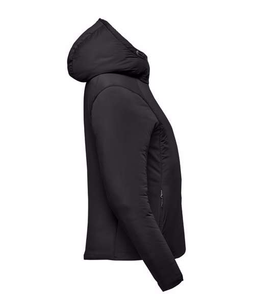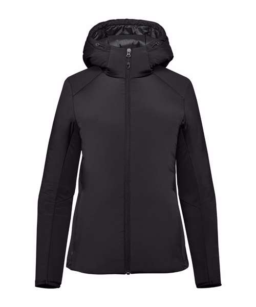Stormtech Thermal Shell™ insulation. Durable water-repellent finish. High-performance stretch woven outer shell. Full-coverage attached hood with easy-lock adjustment. High-density brushed-back knit panels. Articulated elbows. Underarm gussets. Zipped on-seam handwarmer pockets. Single-hand hem adjustment. Partially elasticised cuffs. Contoured seaming. Contains recycled materials.
