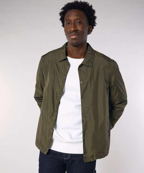 Welt pockets at front. Round drawcords at bottom hem in matching body colour, with metal tipping. Semi-elastic sleeve cuff. Inside chest welt pocket. Self-fabric half-moon at back neck. Inside zip opening at bottom hem and wearer’s left chest for easy decoration.
