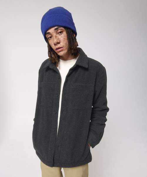 Unisex, unlined shirt jacket. Set-in sleeve. Self-fabric collar with collar stand. Button-down front placket with one button on sleeve cuff. Chest pockets and side seam pockets on both sides. Inside hanger loop in grosgrain tape. Spare buttons attached on inside seam.