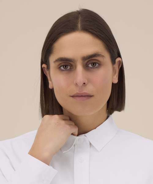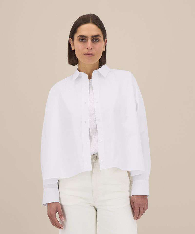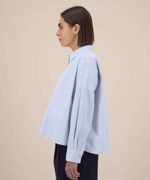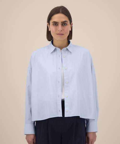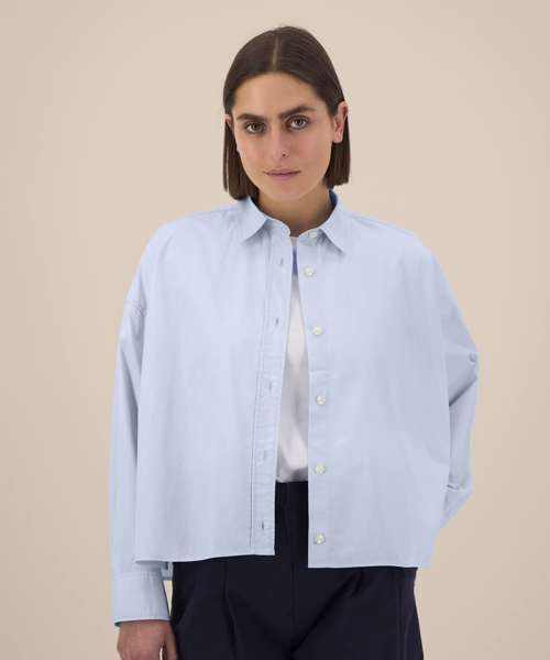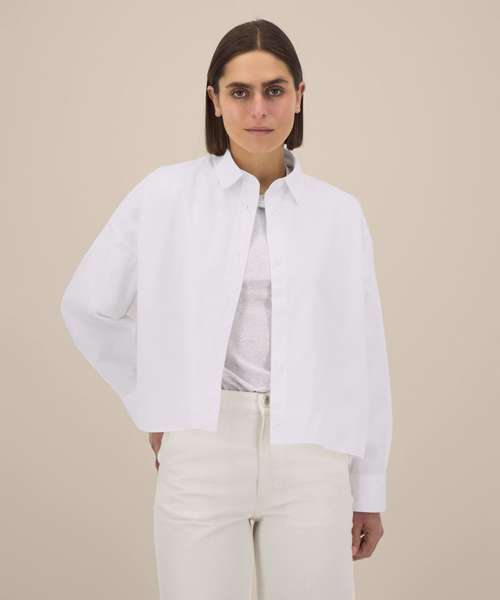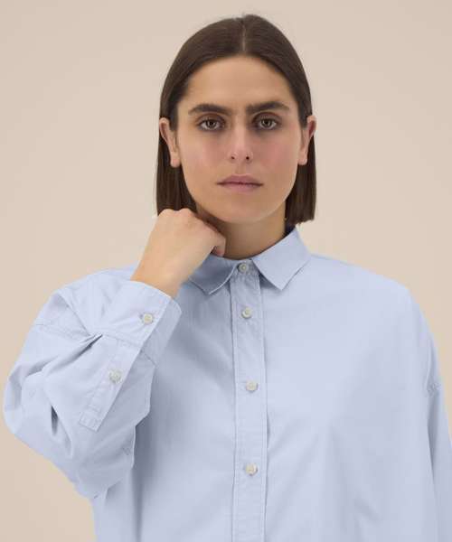 Women’s boxy shirt. Shirt collar with collar stand. Grown-on placket with single-needle topstitching on each side. Back yoke with twin-needle stitching. Forwarded shoulder seam with twin-needle stitching. Dropped shoulders. Square cuffs with single-button opening. Cuff placket with button opening. Shaped hem with side vents. Dipped back panel. Double pleats at cuff. Contains 100% certified organic cotton.