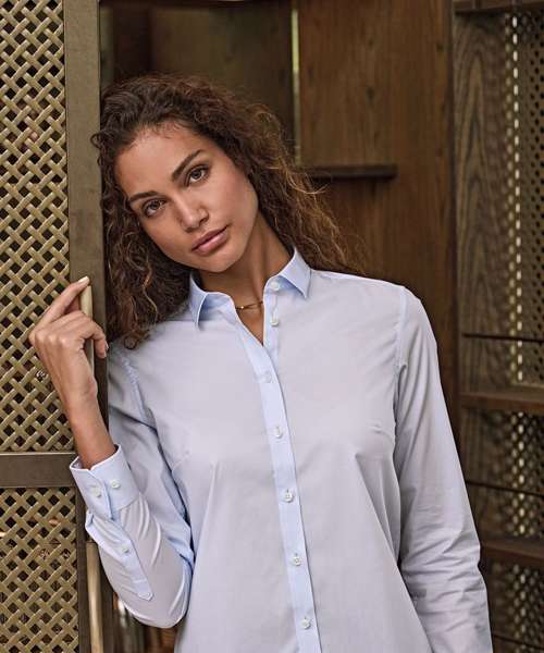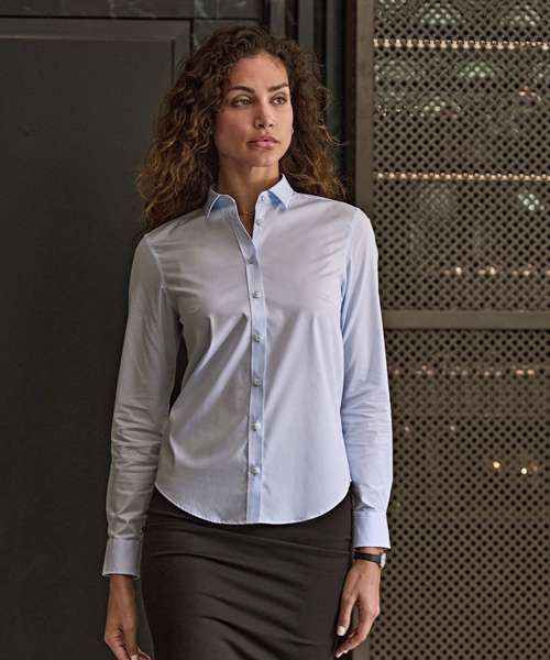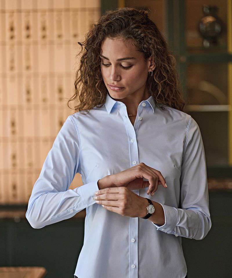 The Women’s stretch luxury shirt is a fitted men’s dress shirt with stretch for total comfort. It features a button-under collar with completely invisible button placement and two-button cuffs.