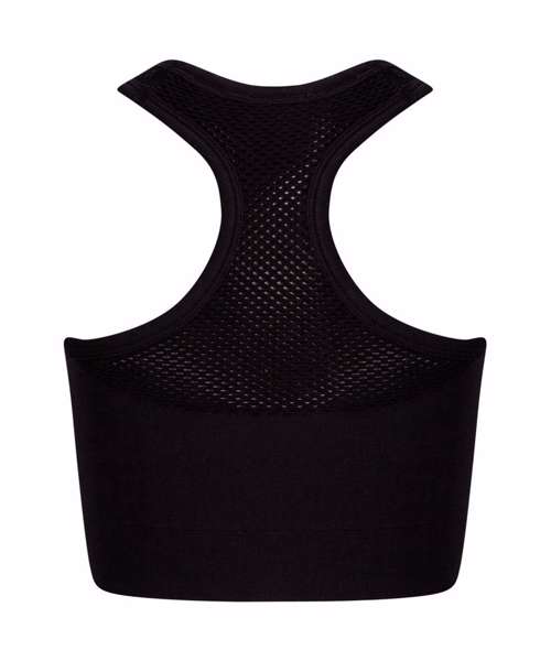 Active crop top and racerback. Self-fabric mesh inserts on front straps, V insert on front and on racerback panel. Self-fabric binding around neck, armholes and back. Tombo tear-out label.