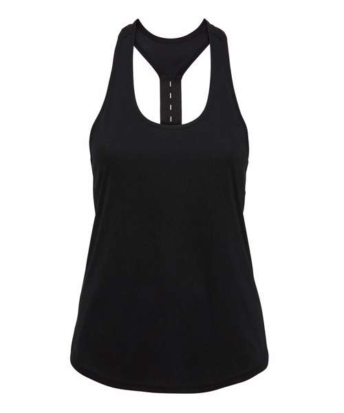 Scoop neck. Elastic racer back with 'laser cut' holes. We recommend using block out vinyl and inks.Product contains no branded neck or waist label. Removable Kimble or looped garment tags. Inner seam label holds important product information on one label with a second label containing brand information which can be cut-away.