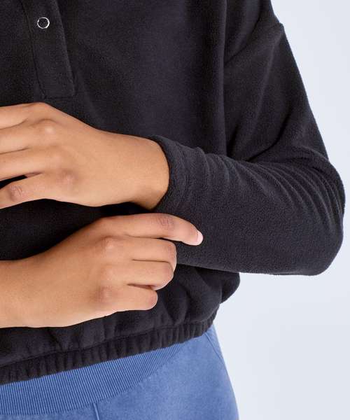 Cropped pull-over fleece with high neck. 1/4 neck popper fastenings to front. Elasticated waistband. We recommend using block out vinyl and inks.Product contains no branded neck or waist label. Removable Kimble or looped garment tags. Inner seam label holds important product information on one label with a second label containing brand information which can be cut-away.