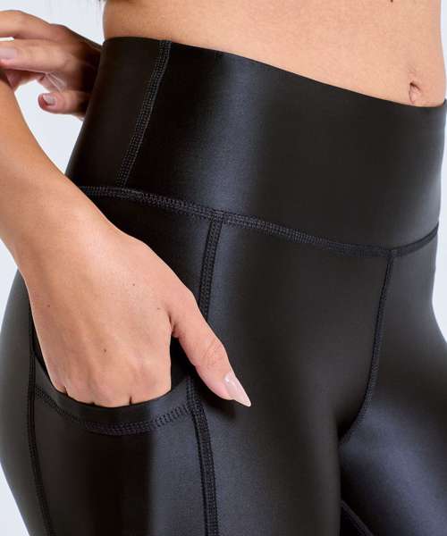 Full-length leggings. Soft-stretch fabric. Elasticated waistband. Pockets to leg. Strategically placed overlock stitching for a flattering fit. High-shine finish. We recommend using block out vinyl and inks.Product contains no branded neck or waist label. Removable Kimble or looped garment tags. Inner seam label holds important product information on one label with a second label containing brand information which can be cut-away.