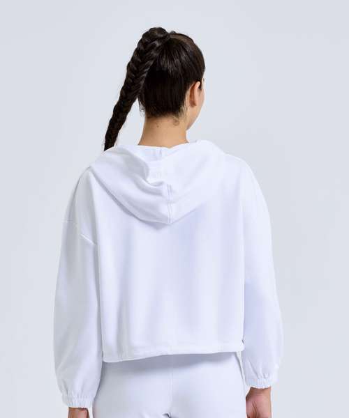 Oversized, cropped, zipped hoodie. Zip to centre. Drawstring tie to waist. Kangaroo pockets to front. Contains recycled polyester fabric. The product contains no branded neck or waist label. Removable kimble or looped garment tags. The inner seam label holds important product information on one label with a second label containing brand information which can be cut-away.