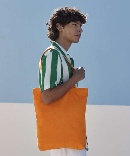 Can be carried by hand or over the shoulder. CutAway label for ease of rebranding. 100% Certified organic cotton.