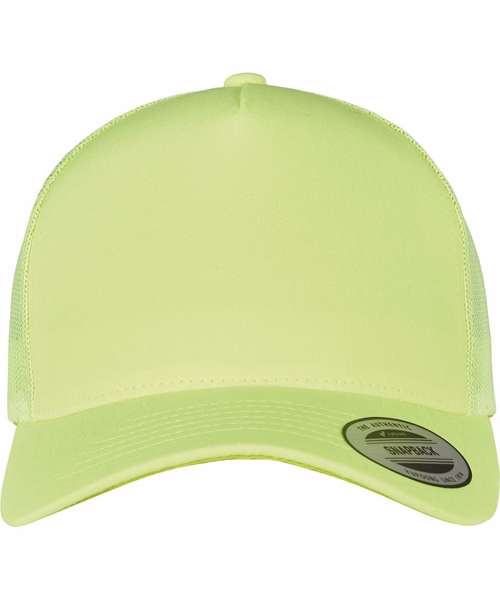 Trucker cap in bright neon colors, polyester mesh, adjustable, and color-matching snapback closure, straight, six-way quilted visor.